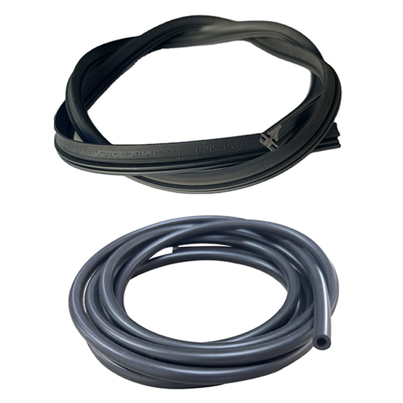 | Дверные уплотнители, оконные каналы, уплотнители люков, уплотнители багажников и т. д. Обычно это соэкструдированные профили, сочетающие губчатую резину и плотную резину. | Внутренняя резиновая трубка и внешняя крышка шлангов охлаждающей воды, шлангов турбокомпрессора, топливных шлангов, тормозных шлангов и шлангов кондиционера. | Ремни ГРМ (резиновая деталь сначала экструдируется для придания формы, затем вулканизируется и склеивается с формой). | Резиновая полоска для щетки стеклоочистителя |