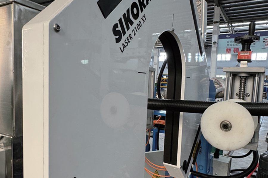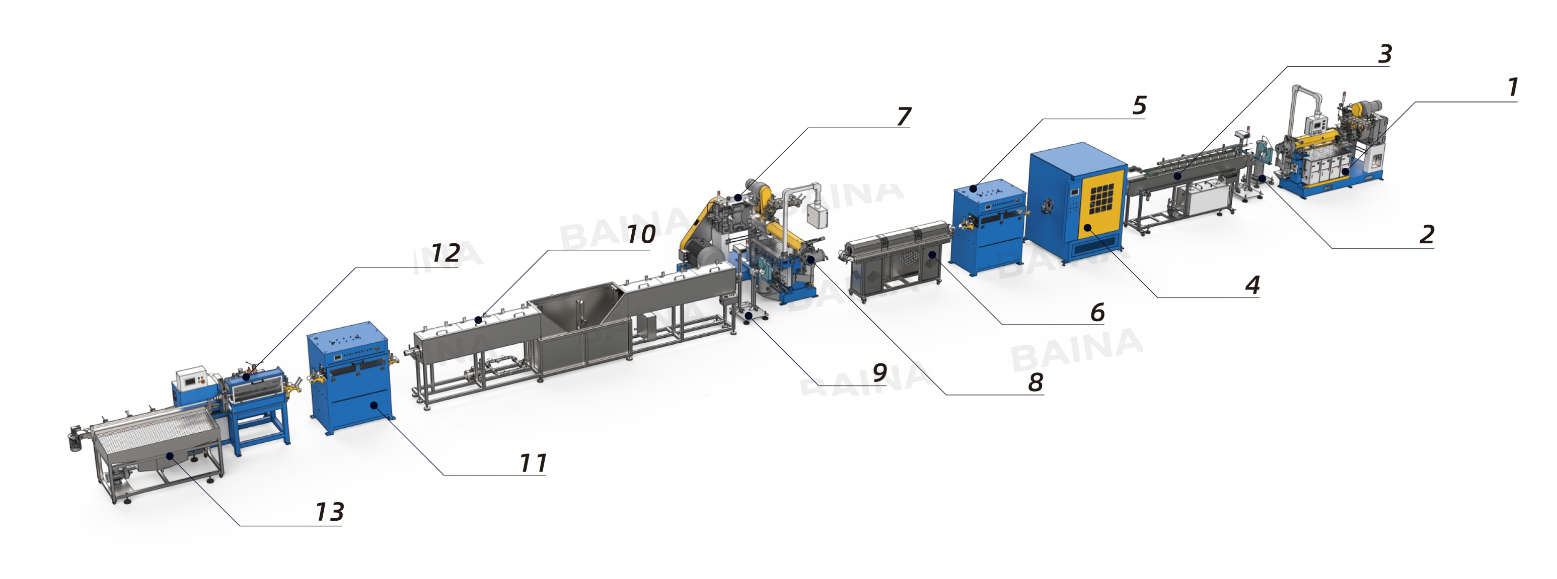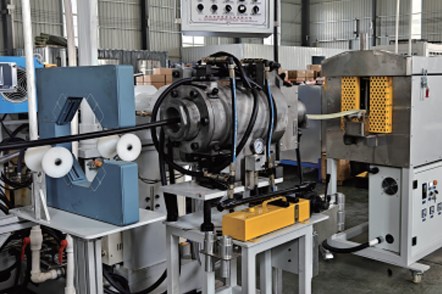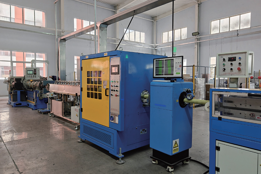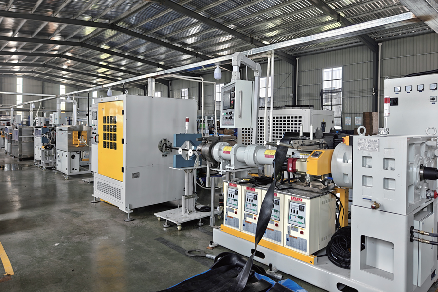 | 1-090mm16D Экструдер холодной подачи | 4-Вязальная машина | 7-Экструдеры покровного слоя | 10-6м Охлаждающая ванна |